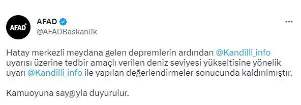 Hatay merkezli meydana gelen zelzelelerin akabinde Kandilli Rasathanesi’nin uyarısı üzerine önlem hedefli verilen deniz düzeyi yükseltisine yönelik ihtar, Kandilli Rasathanesi ile yapılan değerlendirmeler sonucunda kaldırılmıştır.