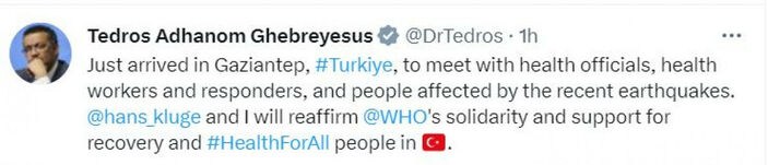 Bölgedeki çalışmaları gözlemlemek maksadıyla Gaziantep’e gelen DSÖ Genel Yöneticisi Dr Tedros Adhanom Ghebreyesus, gelişiyle ilgili şu tabirleri paylaştı: