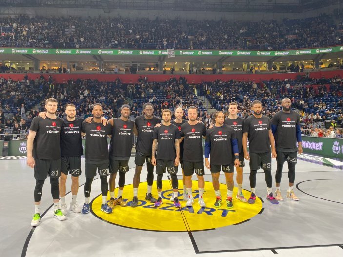 ‘Türkiye İçin El Ele; Bir arada Güçlüyüz’ tişörtleriyle parkeye çıkan Fenerbahçe, müsabakada ‘Siyah’ forma ile gayret etti.