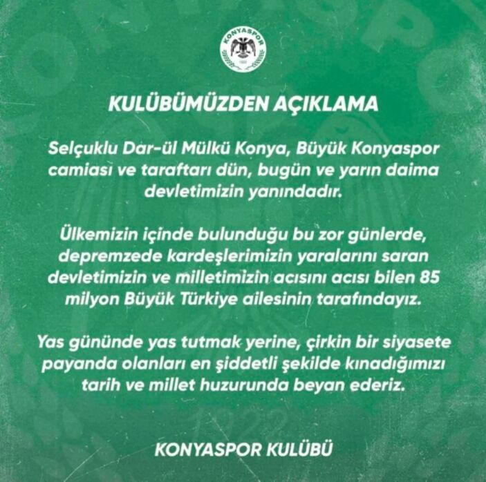 “Selçuklu Dar-ül Mülkü Konya, Büyük Konyaspor topluluğu ve taraftarı dün, bugün ve yarın sürekli devletimizin yanındadır. Ülkemizin içinde bulunduğu bu güç günlerde, depremzede kardeşlerimizin yaralarını saran devletimizin ve milletimizin acısını acısı bilen 85 milyon Büyük Türkiye ailesinin tarafındayız. Yas gününde yas tutmak yerine, berbat bir siyasete payanda olanları en şiddetli halde kınadığımızı tarih ve millet huzurunda beyan ederiz”