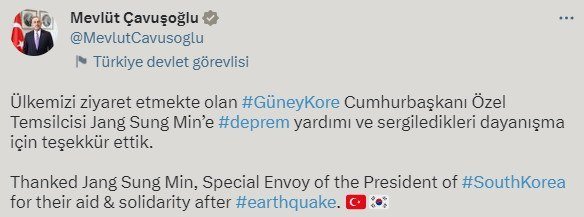 Ülkemizi ziyaret etmekte olan Güney Kore Cumhurbaşkanı Özel Temsilcisi Jang Sung Min’e sarsıntı yardımı ve sergiledikleri dayanışma için teşekkür ettik.